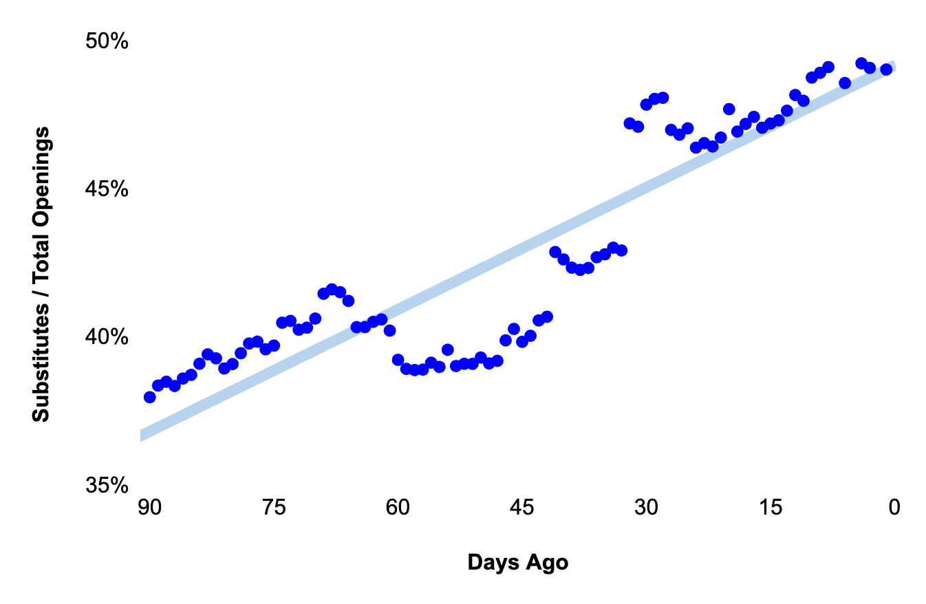 The chart below tracks the percentage of open positions that are for substitutes in the past 90 days, presented as data points and a linear trend line. Data from SchoolSpring.