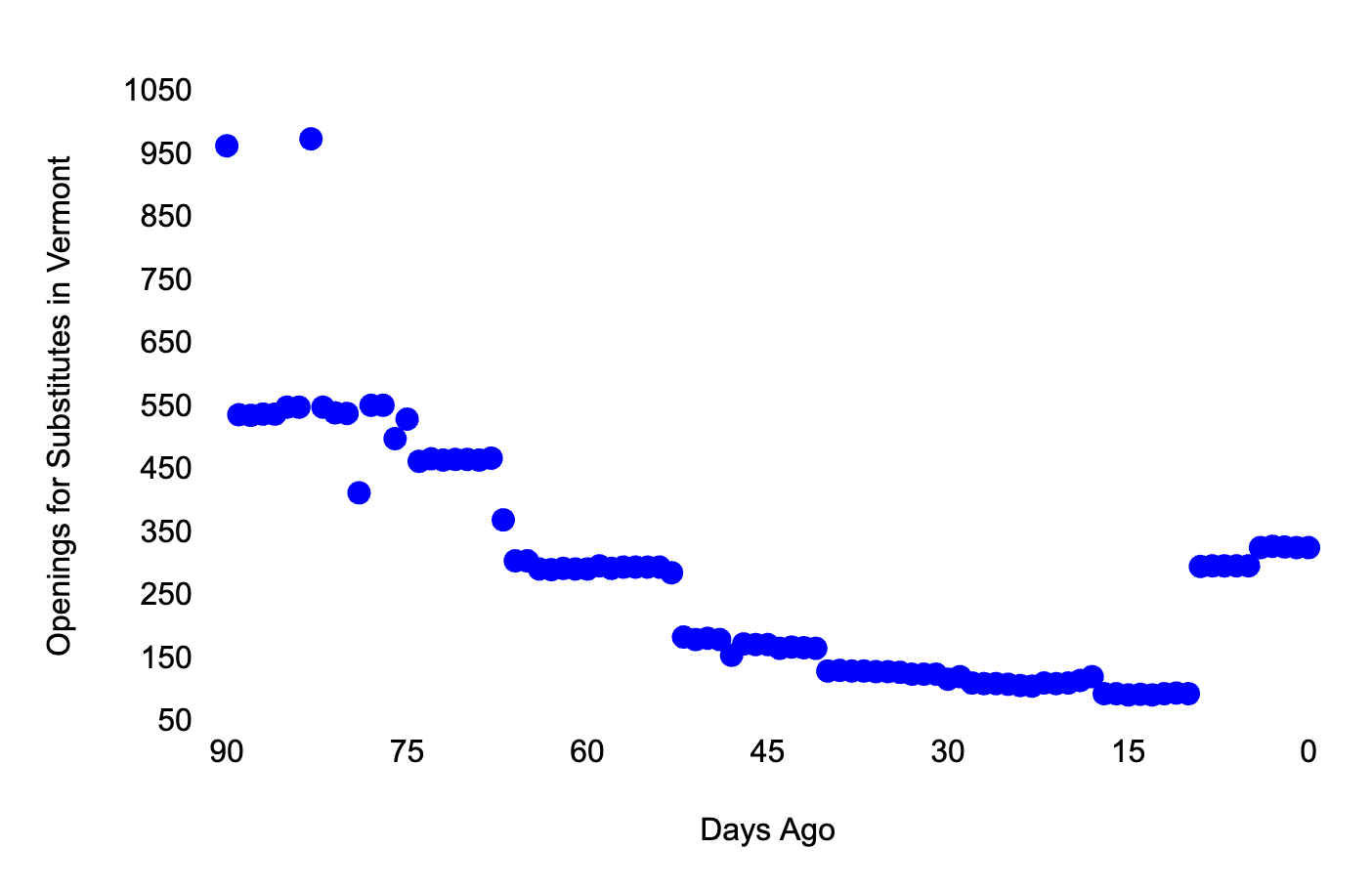 The chart below tracks the percent of open positions for substitutes in the past 90 days, presented as data points and no trend line this time. Data from SchoolSpring.