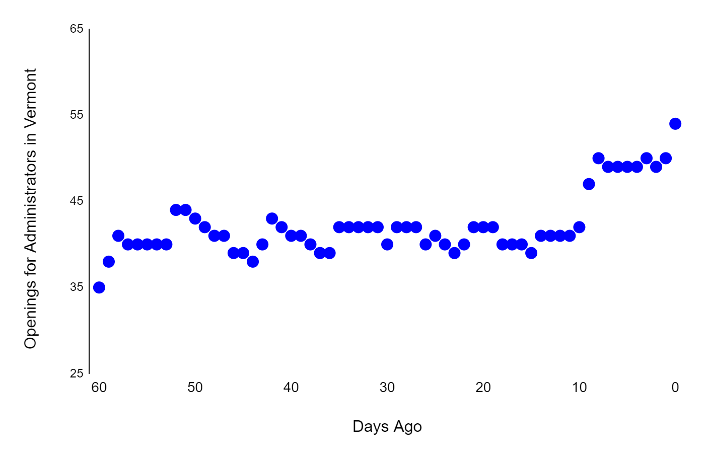 The chart below tracks the number of openings for administrator staff in the 60 days prior to publication, presented as data points and no trend line this time. Data from SchoolSpring.